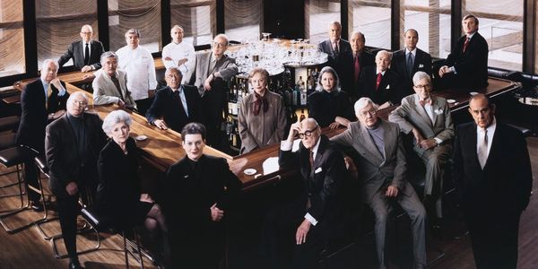 In the photo taken for a Vanity Fair article by Michael O'Neill for The Four Season's 40th anniversary (1997) you will find the following: (outside the bar, counterclockwise from rear left) Albert Kumin, former pastry chef, Roger Martin, press agent, Karl Linn, landscape architect, Ada Louise Huxtable, architecture critic and designer of tableware at the Four Seasons, Phyllis Lambert, project director, Philip Johnson, architect, Richard Lippold, sculptor, Lester Klepper, lawyer, Tom Margittai, former co-owner (with Paul Kovi), and inside bar from left Seppi Rengli, former executive chef, Christian “Hitch” Albin, former executive chef, Philip Miles, press agent, Patrick Lemblé, former pastry chef, George Lois, former ad man, Mimi Sheraton, food writer, Marilynn Gelfman Karp, sculptor, Ron Holland, former ad man, Emil Antonucci, menu and logo designer, George Lang, former director, Alex von Bidder and Julian Niccolini, current co-owners and managing partners.